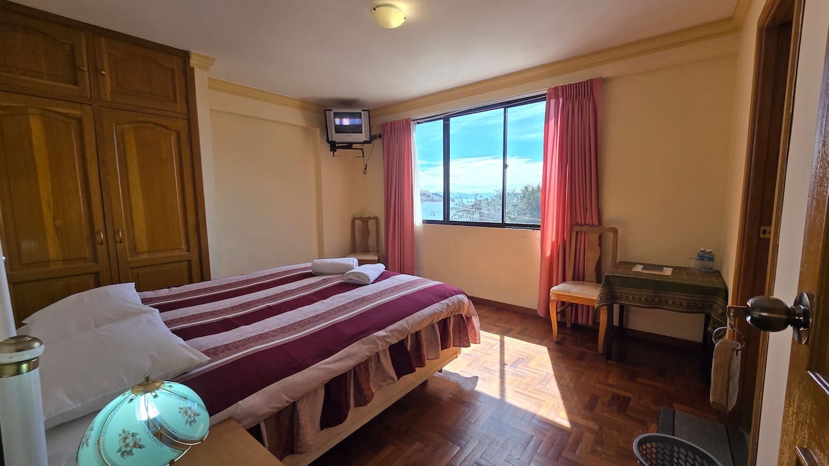 Насолодіться комфортним і затишним перебуванням у цьому просторому номері з привілейованим розташуванням поблизу головного проспекту 6 серпня та посадки на Ісла-дель-Соль. 🛏️ Що пропонує кімната: • Ліжко розміру Queen size • Фреска, розписана вручну, натхненна середземноморським узбережжям • Житлова зона з круглим столом для роботи • Приватна ванна кімната та кабельне телебачення • Опалення для холодного клімату • Електричний чайник 📍 Розташоване в готелі Lago Azul. Забронюйте зараз!
