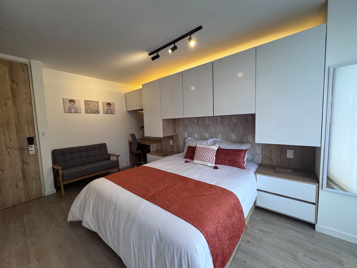 Відремонтована, затишна та повністю облаштована квартира-студія, ідеально підходить для ділових поїздок або відпочинку. Кілька кроків від Titan Plaza та станції Minuto de Dios. У ньому є обладнана кухня, власна ванна кімната, швидкий Wi-Fi і комфортна атмосфера для відпочинку. 15–20 хвилин від аеропорту автомобілем. У цьому районі є супермаркети, пекарні, парки, банки та різноманітні ресторани.