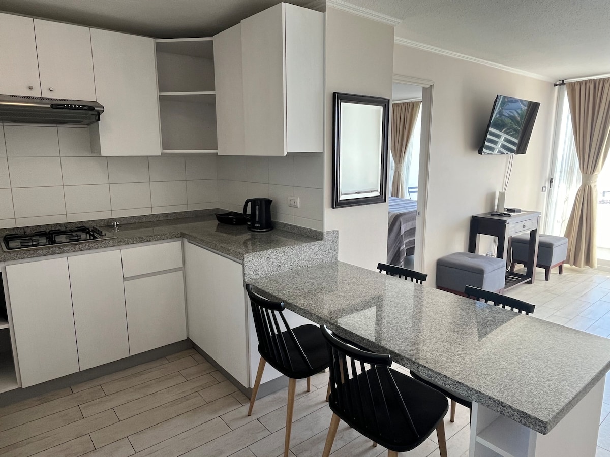 Edificio Avda del Mar es un Condominio Privado ubicado a 30 mts de la Playa un excelente lugar para disfrutar del Sol Mar aire puro y variada gastronomía Relájate y disfruta del paisaje desde la terraza. Ascensor escaleras estacionamiento privado juegos jardín piscina control 24h WiFi SmartTV microondas refrigerador horno Habitación Suite y sofá cama en living capacidad 2 personas. Sábanas y toallas impecables