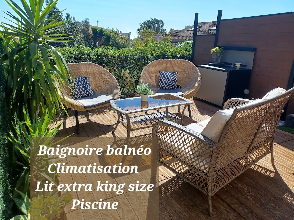 Екологічний будинок із терасою, 5 осіб;можливість додаткового сну; приватний басейн 4,2 м x 4,15 м з 15 червня по 15 вересня, крім неділі; парковка на 2 автомобілі у закритому дворі; Ідеально підходить для сім 'ї або друзів у тихому житловому середовищі. До пляжів Мар-віво (5 хв) і Саблет (10 хв) можна дістатися пішки. Усі магазини в пішій доступності; У 5 хвилинах ходьби від анімації Les Sablettes: ресторани, дитячий парк розваг, нічний ринок...і човен до Тулона.
