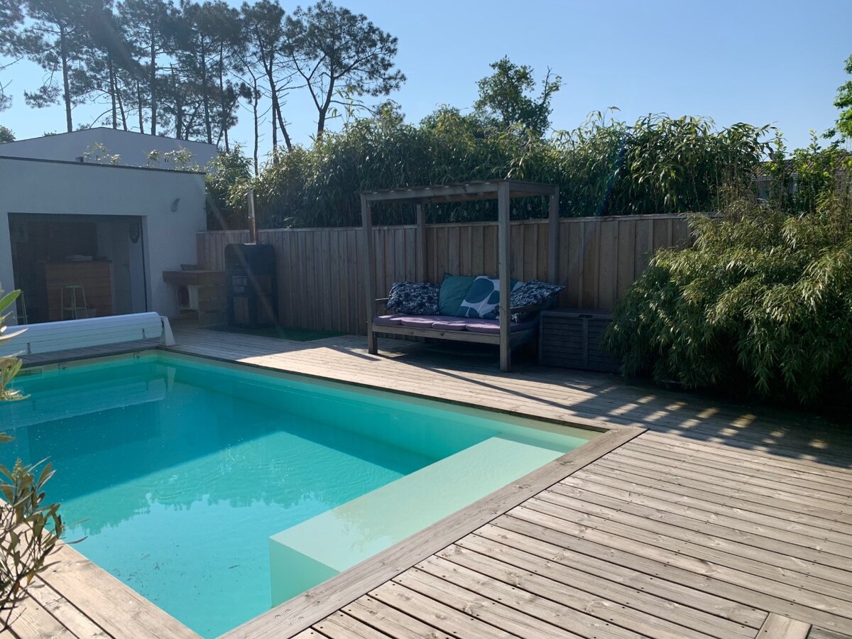 Ідеально розташована вілла, в 10 хвилинах їзди від пляжів Pyla Dune. Дерев 'яна відкрита планування, басейн з підігрівом (з травня по вересень, тепловий насос від 26°, температура води залежно від погодних умов), кухня на відкритому повітрі, майданчик для петанк тощо. 5 спалень (включаючи головний апартамент) з 2 ліжками (140 см) і місцем для зберігання, до 10 гостей. Відкрийте кухню з усіма необхідними зручностями (холодильник XXL, винний погреб, мікрохвильова піч, духовка, Nespresso тощо) 2 ванні кімнати, 2 туалети.