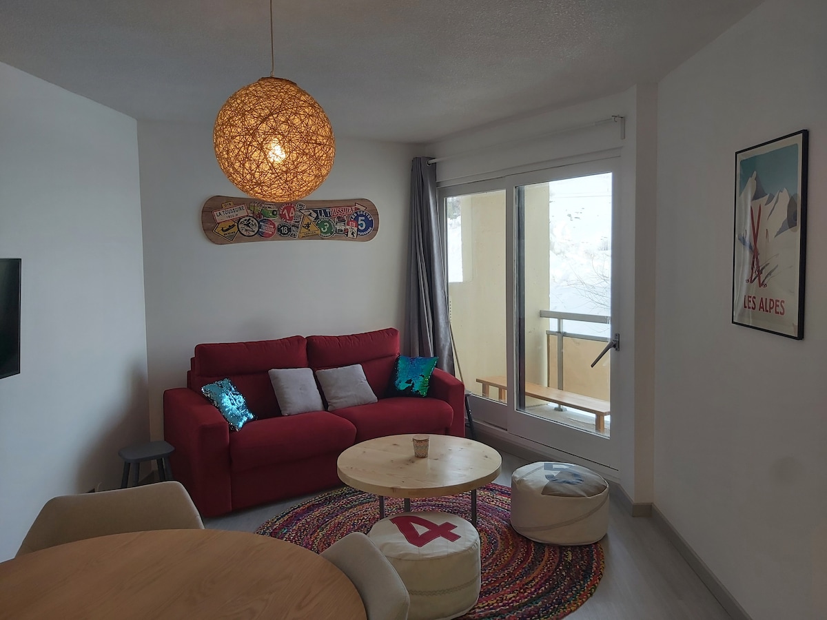 studio de 23 m2 avec balcon ensoleillé, vue sur les montagnes. 1 chambre fermée avec lit double 140 + 1 petit canapé convertible 1 place 1/2 (ou 2 si petits enfants moins de 10 ans) dans la pièce principale (+ 1 lit pliant en 80 cm pour 1 enfant). Possibilité pour 2 adultes + 2 enfants si petits. Casier à skis. 2ème étage sur 7 au pied des pistes et à 2 pas des commerces résidence fermée la nuit parking privé, fermé. Uniquement du samedi au samedi pendant les vacances scolaires