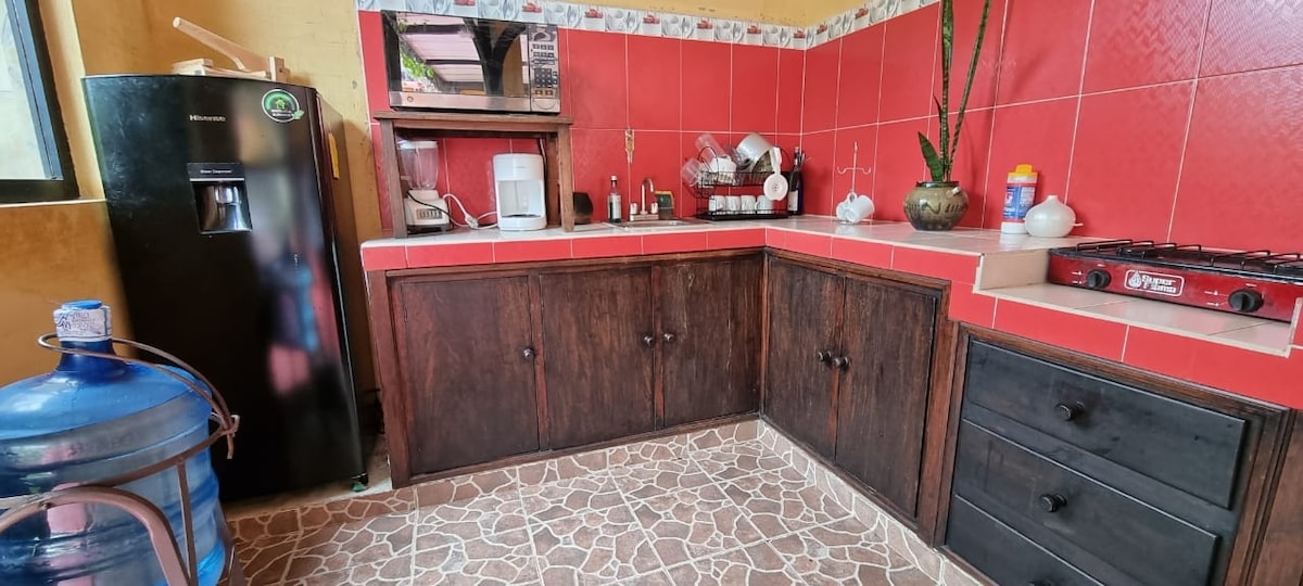 La casa es un loft contemporáneo, verás mobiliario hecho a la medida del espacio, decoración regional y acabados rescatados de la construcción original como lo es la piedra de los muros de bajareque que colocamos arriba de la cocineta o la tarja que data de los años 50's. La habitación en planta alta responde a las necesidades de almas viajeras. Cuenta con una cama Queen size y debajo de ella corre una base de un colchón de la mejor calidad para tu descanso.