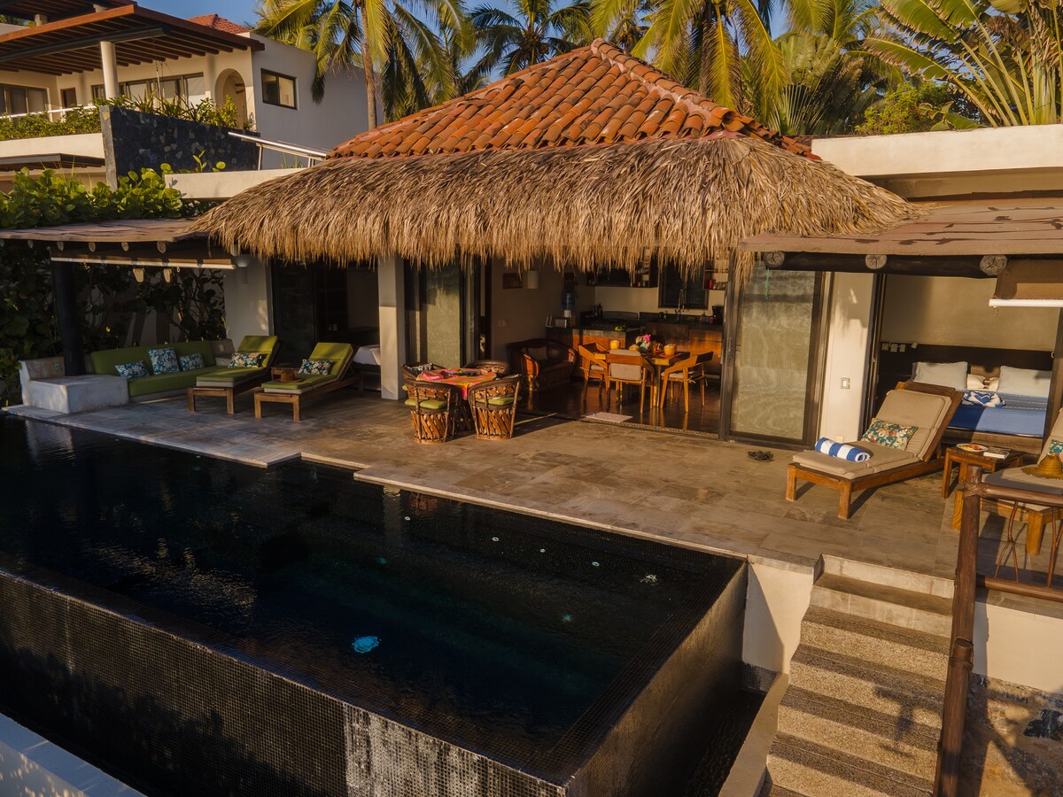 Красивий будинок на пляжі з 2 спальнями на набережній неподалік від місця для серфінгу в La Saladita. У нашому домі є красиві внутрішні та зовнішні житлові приміщення. Крита тераса та безбортний басейн ідеально підходять для відпочинку та перевірки відпочинку. У спальнях є ліжка розміру King size із ванними кімнатами, кондиціонерами та вентиляторами. Кухня повністю обладнана і оснащена гранітними стільницями, дерев 'яними шафами та мідною раковиною. Високі ткані стелі палапи додають простору вітальні.