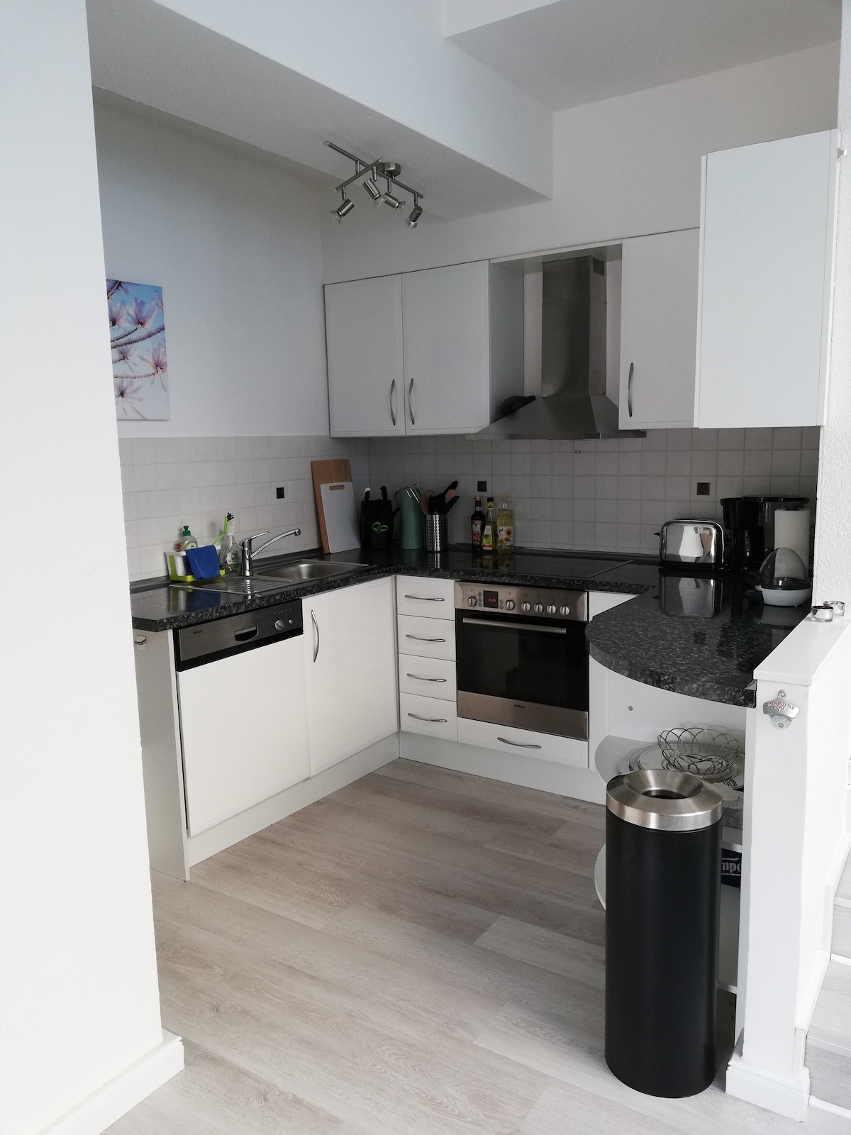 Фріш відремонтував дизайнерську квартиру всього за 350 м від пляжу. Квартира повністю мебльована для спокійного перебування. Рушники, постільна білизна, повністю обладнана кухня і в комплекті є швидкий Wi-Fi. Смачні ролети можна замовити неподалік від ресторану REWE. REWE знаходиться в пішій доступності. Автобусна станція також знаходиться поруч із будинком. І найкраще... пляж і гавань Олімпії поруч... просто переїжджайте і відчувайте себе як удома.