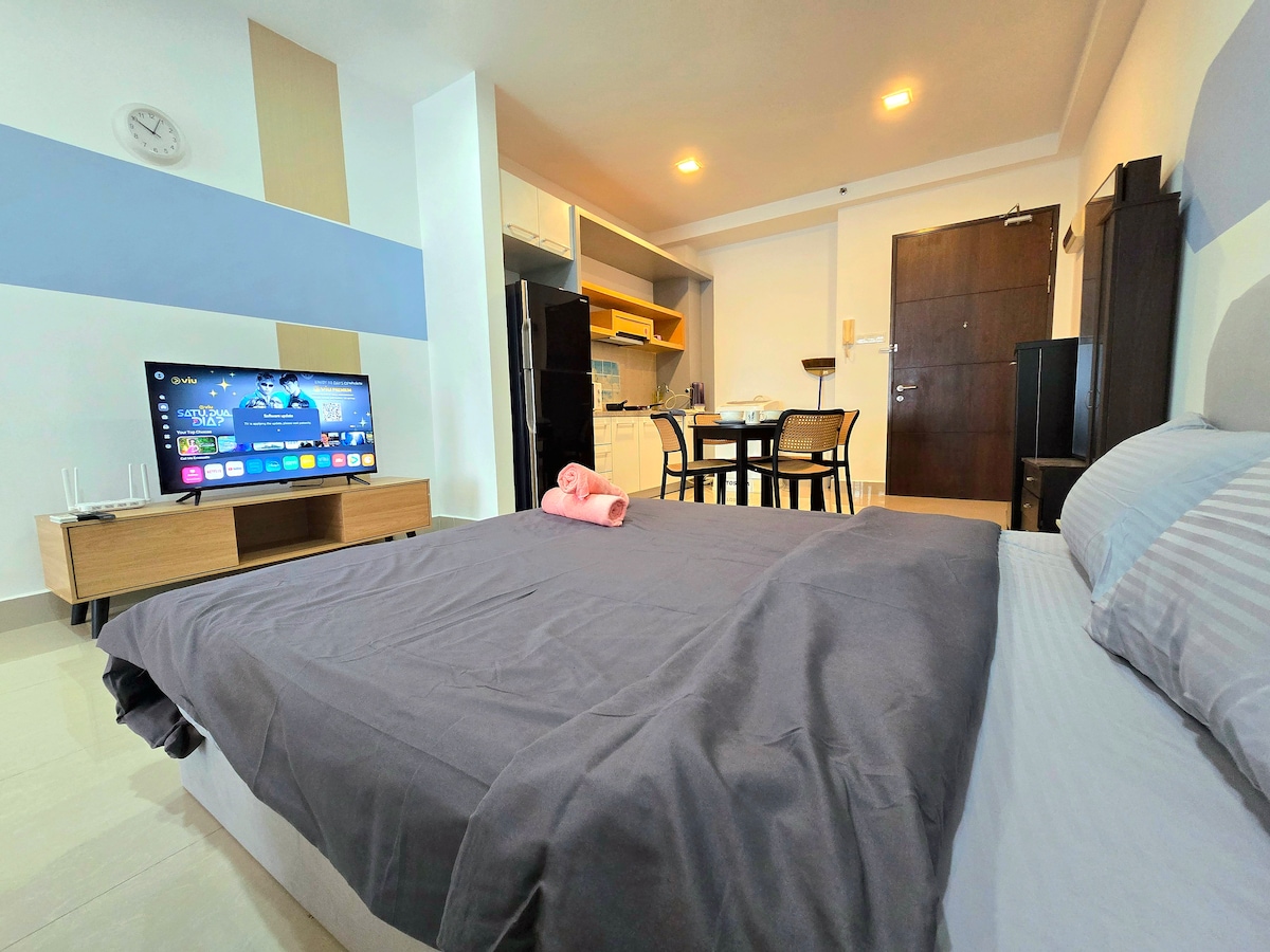 Ознайомтеся з нашою затишною студією, де можуть розміститися від 2 до 3 осіб з ліжком queen-size та диваном-ліжком. Помешкання розташоване всього в 15 хвилинах їзди від KLIA T1/T2, оточене багатьма ресторанами, філіями фаст-фуду, продуктовими магазинами та пральнями. Насолоджуйтеся всіма зручностями, зокрема дитячим ігровим майданчиком, зоною барбекю, тренажерним залом і басейном, з цілодобовою охороною. * Недоступно, щоб залишити багаж до часу прибуття. Щоб дістатися до будівлі, потрібно пройти 10 сходинок, щоб дістатися до ліфта.
