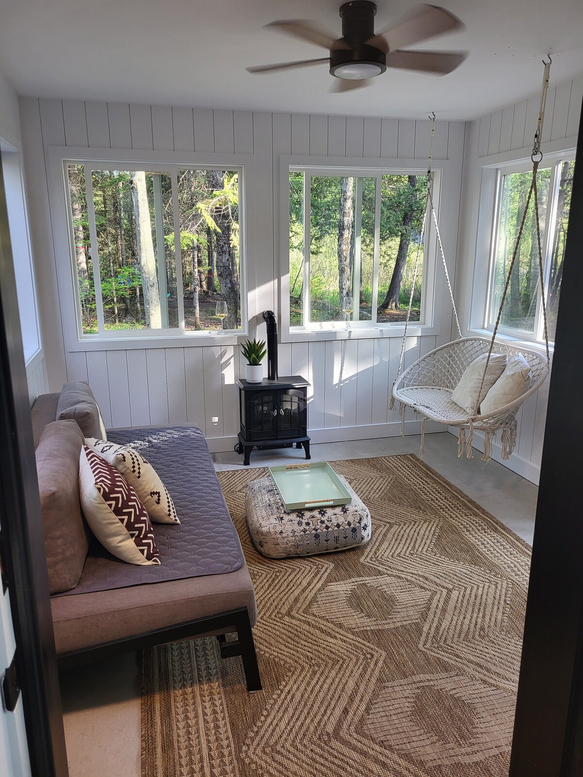 Our Nordic forest chalet is perfect for spending quality time as a couple (or with a kid), or for a work-retreat (with high-speed WiFi). The wooden interior is warm and cozy. The full-height windows offer stunning views over a forested valley. The open-concept kitchen and living room keep you in the conversation while cooking. If you prefer to cook outside, there is a fire pit with a grill and outdoor dining table. Only 70-min drive from Montreal. The lake is a 25-min walk if you park nearby.