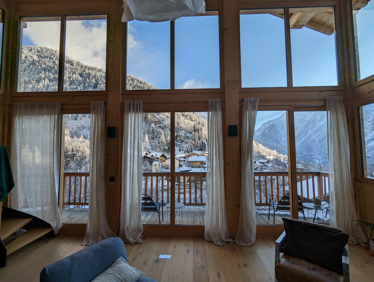 Chalet Alma is located at 1250m in the charming hamlet of Le Miroir in Ste Foy Tarentaise and at the crossroads of the most beautiful ski areas in Tarentaise - Val d'Isère, Tignes, Les Arcs, La Rosière and Ste Foy. Inspired by traditional Savoyard chalets made of stone, wood and lauze roofing, but resolutely modern, Chalet Alma, with its southern exposure and entirely glazed façade, has a unique view of Mont-Pourri and its eternal snow at 3,779m. Inaugurated in July 2021.
