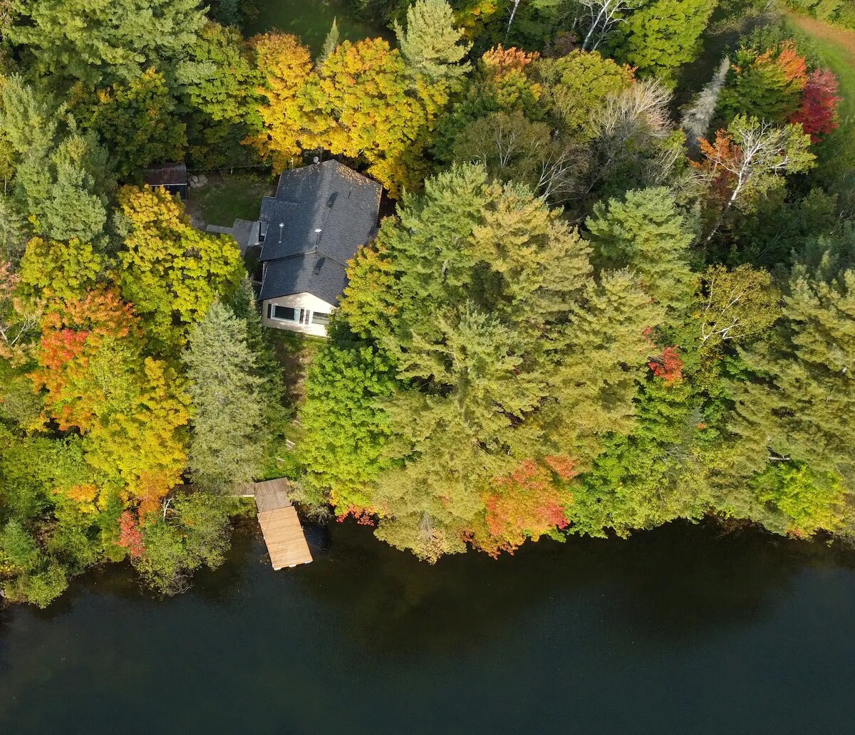 Наше скандинавське лісове шале ідеально підходить для проведення часу в парі (або з дитиною) або для роботи (з високошвидкісним Wi-Fi). Дерев 'яний інтер' єр теплий і затишний. З повноцінних вікон відкривається приголомшливий вид на лісову долину. Кухня відкритого типу та вітальня тримають вас у розмові під час приготування їжі. Якщо ви віддаєте перевагу готувати на вулиці, є місце для багаття з грилем і обіднім столом на відкритому повітрі. Всього в 70 хвилинах їзди від Монреаля. Озеро знаходиться в 25 хвилинах ходьби, якщо припаркуватися неподалік.