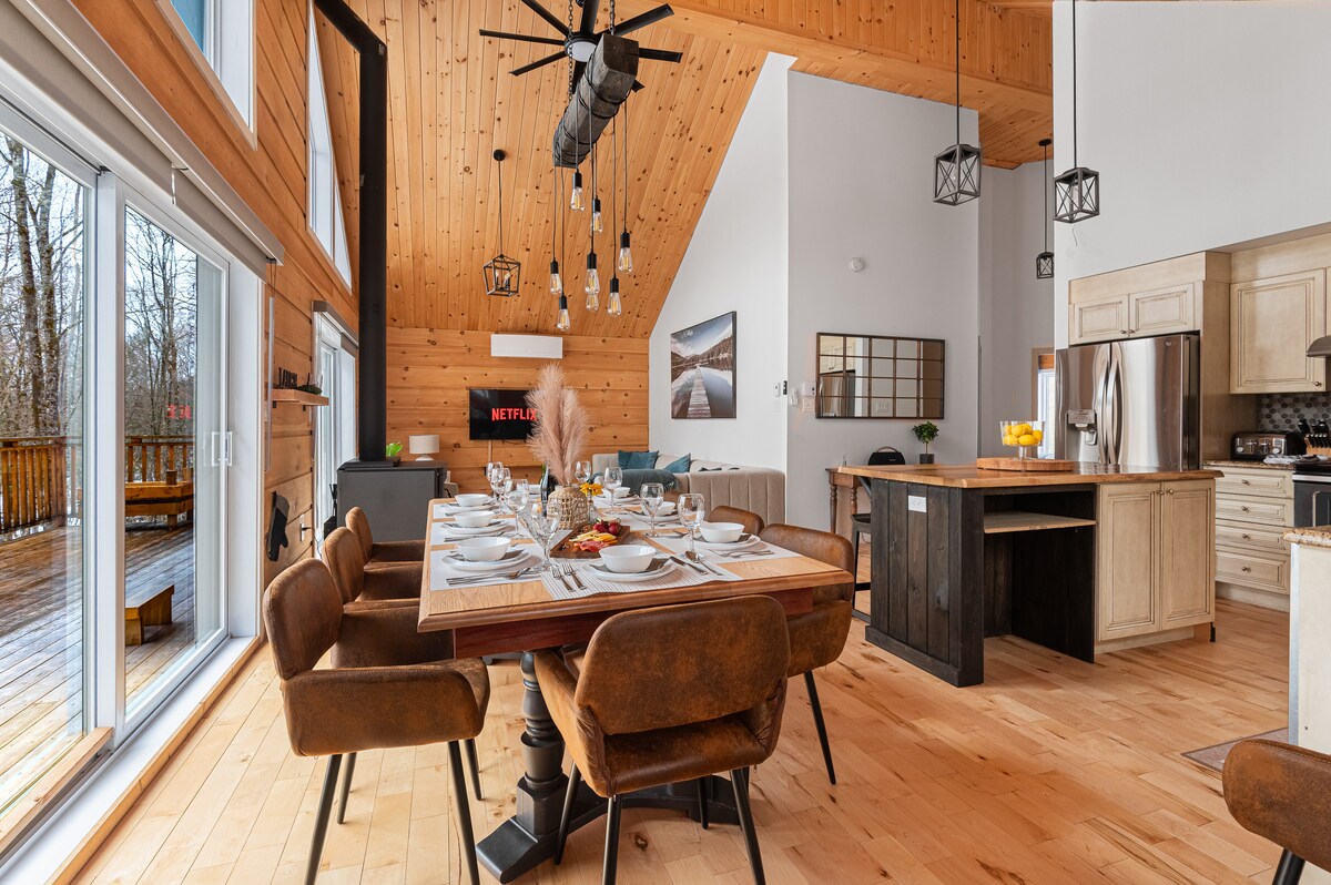 Grand chalet rustique et chaleureux : bord de l’eau, spa, foyer à bois intérieur et extérieur. Un lieu idéal pour relaxer en couple, en famille ou entre amis. Laissez-vous immerger dans la nature des Laurentides et venez profiter des baignades, kayaks et randonnées. A rustic and warm wooden chalet : waterfront, spa, wood-burning fireplace. Ideal place to relax in couple, with your family or friends. Be immersed in the nature of the Laurentides and enjoy the swimming, kayaking and hiking.