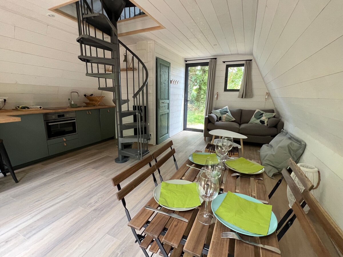 Отримайте враження для двох осіб або сім 'ї, проводячи ніч у нашому дерев' яному Тіпі! Розташований на маєтку в парку площею 4 гектарів, Tipi пропонує вам виняткове місце, щоб опинитися в центрі природи, з усіма зручностями, гідними готелю. Він повністю обладнаний як невеликий будинок для проживання (спальня нагорі, диван-ліжко на першому поверсі з міні-кухнею та вітальнею, ванна кімната, велика тераса)