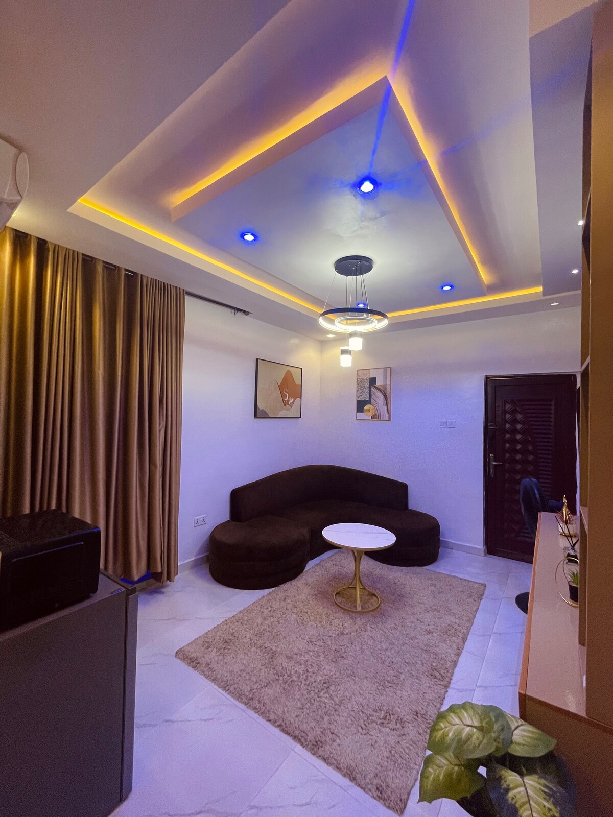 Features: Ac, Refrigerator, 24hrs power supply with inverter backup plan, microwave, kitchen with utensils, Heat Extrator, Water heater, Gas cooker, chandelier, Gated compound with Car park, PS4 video game, Dstv, Security personnel. kick back and enjoy our peaceful and stylish apartment