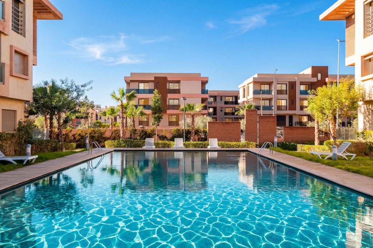 Гостюйте в центрі Марракеша в нашій квартирі з 2 спальнями та 2 ванними кімнатами. Насолоджуйтеся високоякісною постільною білизною Simmons, високошвидкісним Wi-Fi (волоконно-оптичний) та сучасним декором з приватним басейном. Повністю обладнана повністю обладнана кухня, стильна ванна та італійський душ. За декілька хвилин ходьби від площі Джемаа-ель-Фна, Плацца та Карре-Еден. Басейн не опалюється. Примітка. Незаміжні марокканські пари заборонені.