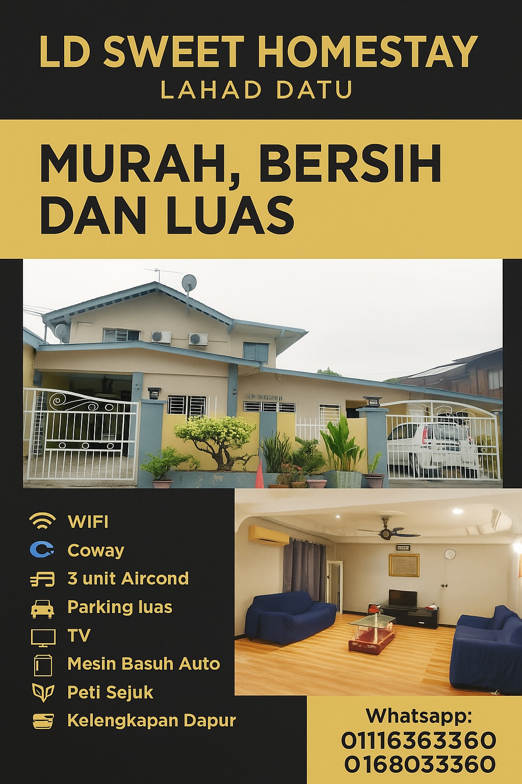 🏡 Ласкаво просимо до Alur House в Лахад-Дату Відпочиньте в просторій квартирі в Alur House, розташованій у тихому житловому районі Таман Аман 1, Лахад Дату. Призначено для сімей, групових або ділових поїздок. Незалежно від того, чи ви відвідуєте Лахад-Дату для короткого відпочинку, відвідуєте весілля або просто шукаєте тихе місце для відпочинку, Alur House вітає вас з відкритими обіймами. Будинок поєднує в собі теплі штрихи сучасного деревенського декору, завдяки яким ви відчуєте себе як удома.