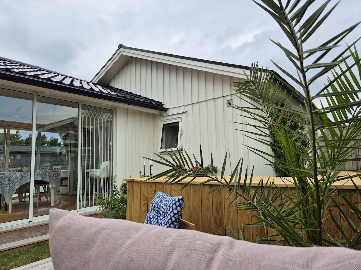 Ласкаво просимо до нашого затишного та сучасного котеджу в центрі Меллбістранда – всього за 200 метрів від моря та найдовшого піщаного пляжу Швеції! Про заміський будинок Котедж був нещодавно побудований у 2021 році і має все необхідне для відпочинку: - Дві спальні зі зручними ліжками – Кухня та вітальня відкритого планування - Ванна кімната з душем, туалетом та пральною машиною. Приватна прибудинкова територія Окремий вхід і дерев’яна тераса – ідеально підходять для довгих літніх вечорів на сонці!