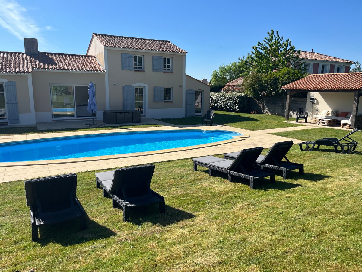 Nouveau en 2025 ! Après le succès de la villa d'Adèle située a quelques pas ( vous pouvez consulter les avis) cette villa au calme et élégante avec sa grande piscine privative ( ouverte du 1/05 au 30/09 ) est parfaitement équipée pour 8 personnes. Elle se trouve a moins de 15 mn de la mer et Coex avec ses commerces à 3 km. Nombreuses pistes cyclables . Accès au Golf de Saint gilles .Terrain de pétanque en accès libre.Lits faits à votre arrivée. Jardin Clos. Vue sur le Golf. Table ping-pong