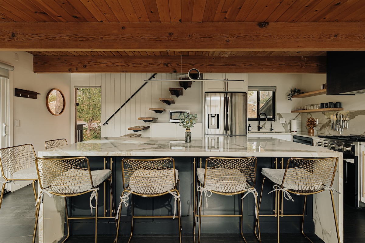 Perched on stilts, this modern Swiss chalet is nestled in the mountains of Southern California. Designed with tranquility and comfort in mind, the cabin blends its 1970’s charm while elevating modern luxuries like heated floors, a chef’s kitchen, and wall-to-wall doors. Enjoy all nature has to offer with skiing in the winter, hiking in the summer, and breathtaking views, epic sunsets, and stargazing all year round.