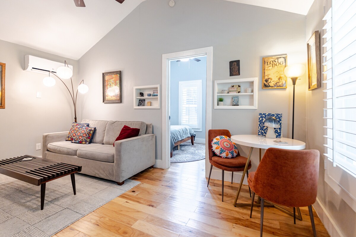 Ця дивовижна студія наповнена природним світлом і атмосферою Остіна. Зручне та ідеальне місце для бізнес-мандрівників і туристів, які хочуть бути поруч із усім, що може запропонувати Остін. У пішій доступності від басейну Бартон-Спрінгс можна поплавати або до парку Зілкер для спокійної прогулянки, пробіжки або велопрогулянки. Прокатіться на велосипеді або скутері до центру міста й насолоджуйтеся багатьма ресторанами та магазинами, які може запропонувати місто.