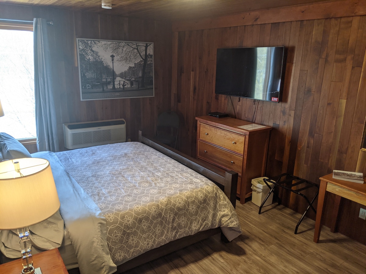 ➤ Ласкаво просимо до Timberline Lodge – прогулюйтеся до центру Елікоттвіля! ★ 3–5 хвилин їзди до курортів Holiday Valley та HoliMont ➤ Розташована на 3-му поверсі, ця простора кімната має ліжко розміру queen size, міні-холодильник під 43-дюймовим смарт-телевізором (з Netflix) і безкоштовний високошвидкісний Wi-Fi. • У цій окремій кімнаті є двоспальне ліжко розміру Queen size та двоярусне ліжко розміру Double size зі свіжою постільною білизною (максимум 4 особи) • Повноцінна ванна кімната з зручностями та додатковими рушниками • Ідеально підходить для гірськолижних вихідних, пар і короткострокового перебування протягом усього сезону