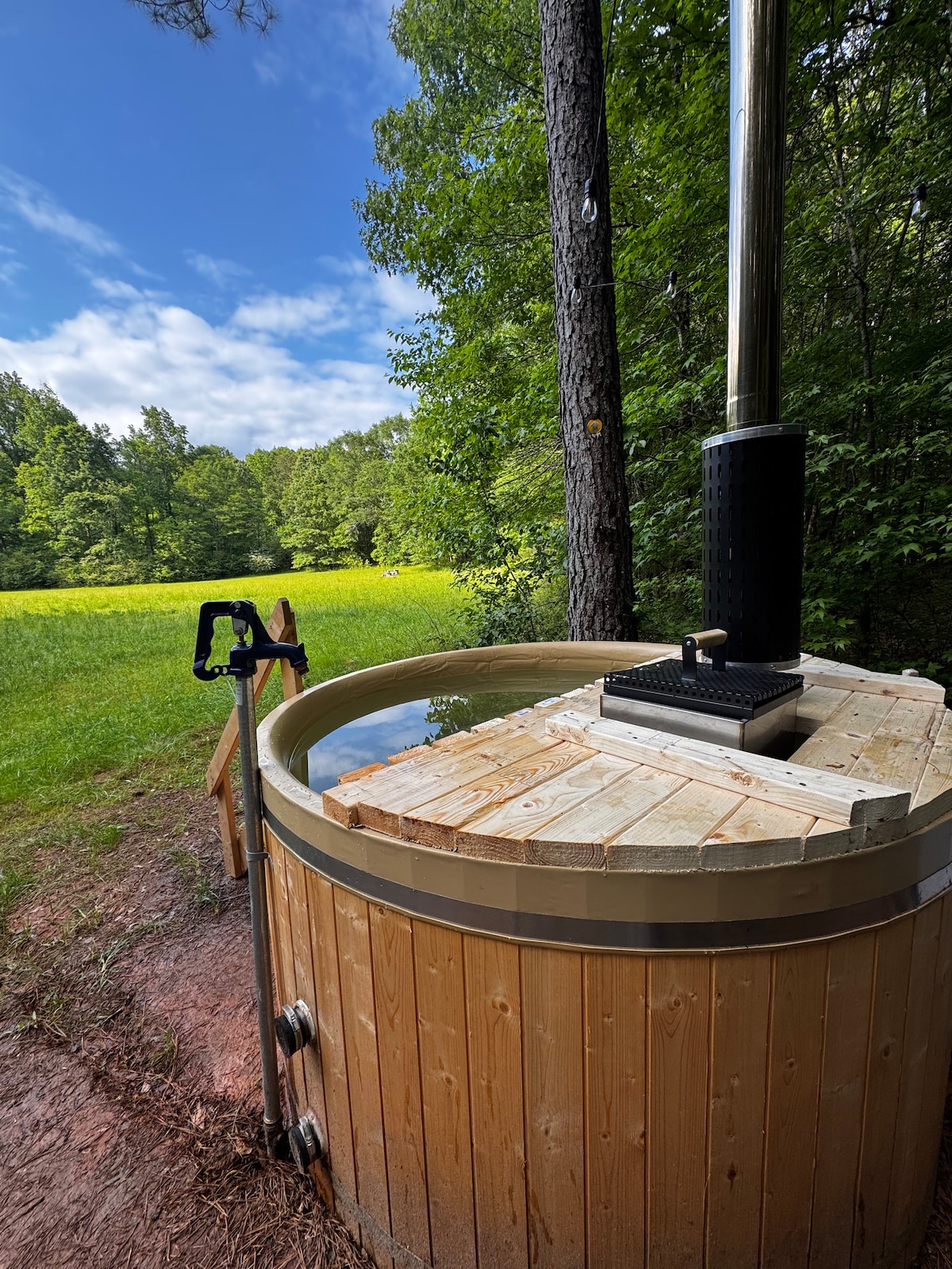 Escape to our fairytale, on 100 secluded acres of gorgeous forest on Lake Wedowee/river (short walk to water down road). Soak in the hot tub, bake a pizza in the wood-fired oven, snuggle in nest swing or stroll the river road to swim or kayak. Hike to Wolf Creek and pan for gold. This gorgeous cabin is inspired by the 1840s rock chimneys-found in the forest—built with reclaimed heart of pine, stained glass & cedar from the woods. No tv—this is a place to unplug. No kids under the age
