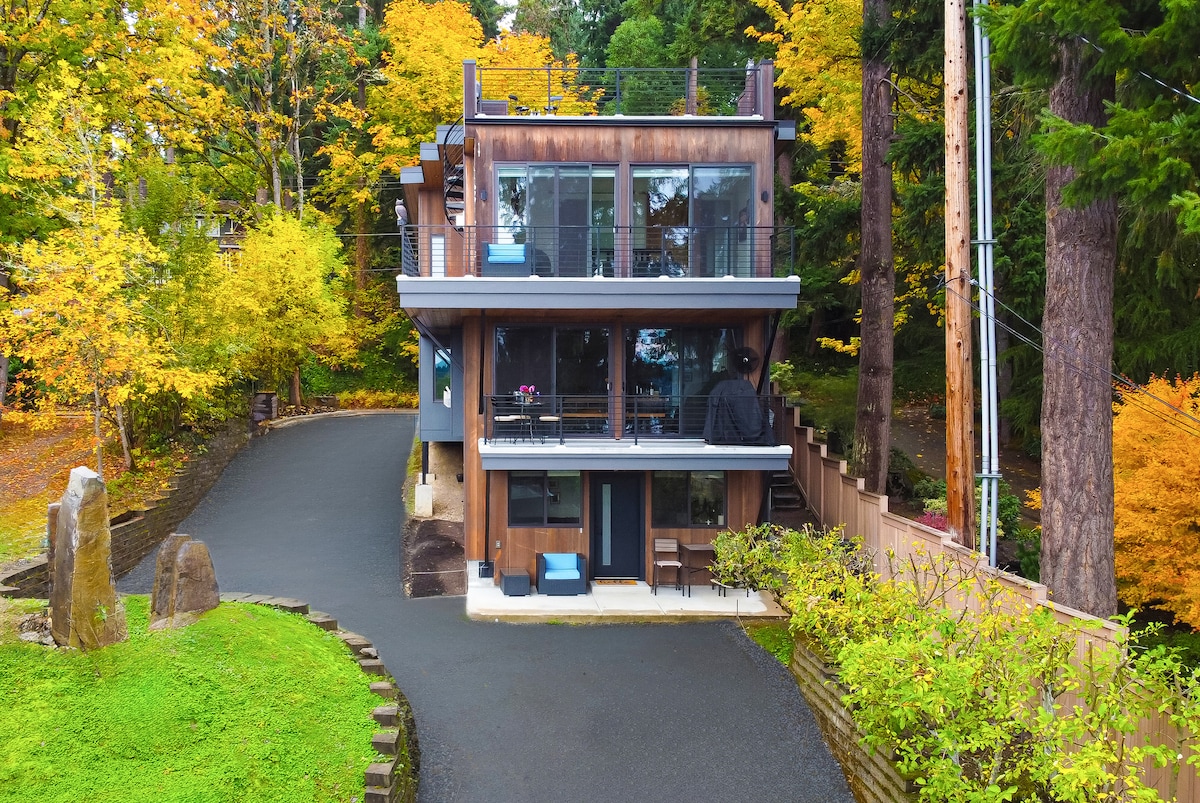 Цей чарівний притулок був побудований Пітом Нельсоном у 2017 році. Світлий дерев 'яний інтер' єр і вікна простягаються від підлоги до високої стелі всередині цього затишного, але розкішного будинку на дереві. Просторий інтер 'єр, розташований на тридцять акрах лісу, зручно мебльований і оснащений природним освітленням. Оснащена гарячим душем на відкритому повітрі, Wi-Fi, 100-дюймовим екраном/проектором та гідромасажною ванною, ви справді можете відпочити від нього серед пишних вічнозелених дерев всього в 10 хвилинах від Редмонда.