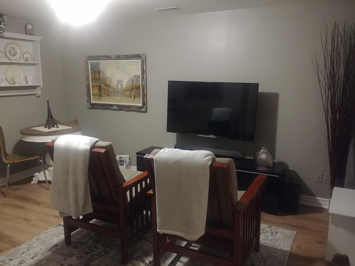 Ласкаво просимо до Нового Торонто! Поруч із входом є паркування на проїзній частині. Велика затишна квартира на нижньому поверсі в селищі на березі озера, Озеро Онтаріо знаходиться в кінці вулиці. Прекрасний краєвид на центр Торонто. Повноцінна кухня з плитою та духовкою. Великий обідній стіл. Зручний Г-подібний диван. Одна спальня з ліжком розміру «queen-size». Пральна машина, сушарка, пральня. Wi-Fi Netflix, Prime Video, Забронюйте помешкання на місяць або довше, візьміть із собою домашнього улюбленця.