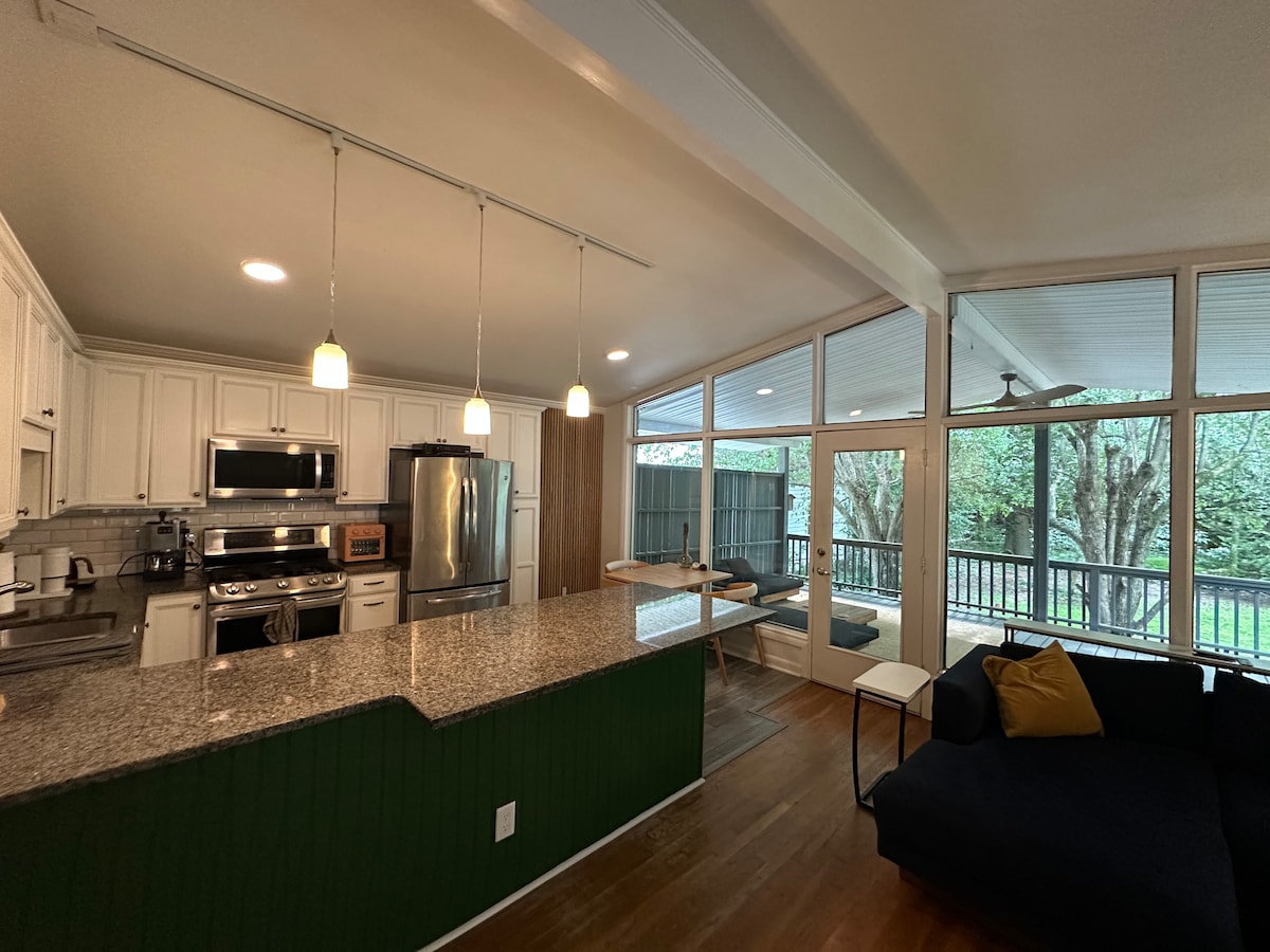 Starmount Forest is a quiet upscale neighborhood in the heart of Greensboro. Located just half a mile from upscale dinning and shopping In Friendly Center. This Spacious 2300 sq ft home features an inviting open floor plan with a large kitchen, den, living room and sunroom. The Kitchen is fully equipped with stainless appliance and everything you need to cook your favorite meal. New Furnishings throughout, master bath boasts large walk in shower, and every bedroom is equipped with a smart TV.