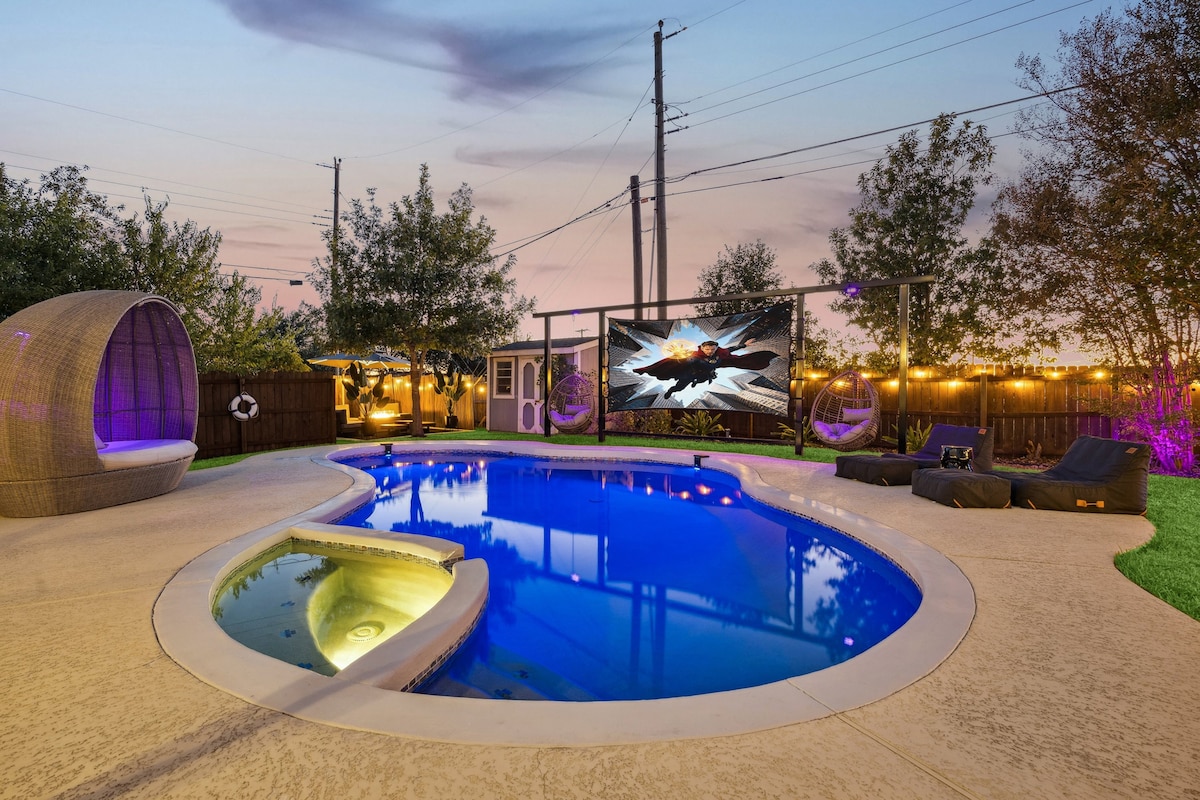 ✨Timeless-Texas-Inn✨ • Великий задній двір тепер із міні-гольфом⛳! - 🔥Басейн з підігрівом 🌊 - барбекю та безліч ігор для максимального техаського веселощів! • Уночі задній двір світиться вогнями кафе, 🔥вогнищами та приголомшливою альтанкою, що випромінює ПОЗАЧАСОВИЙ декор і чарівність. • НОВА КІНОЗАЛА 🎦🍿- 🎮Ігрова кімната - 🎱Більярдний стіл - 🎯Дротики - Аркади та настільні ігри - створення ідеального простору для груп, щоб створити незабутні спогади в ідеальній обстановці! • 8 хв до КАЛАХАРІ • 12 хв до Домейна • 20 хв до ОСТІНА 🎸🎶