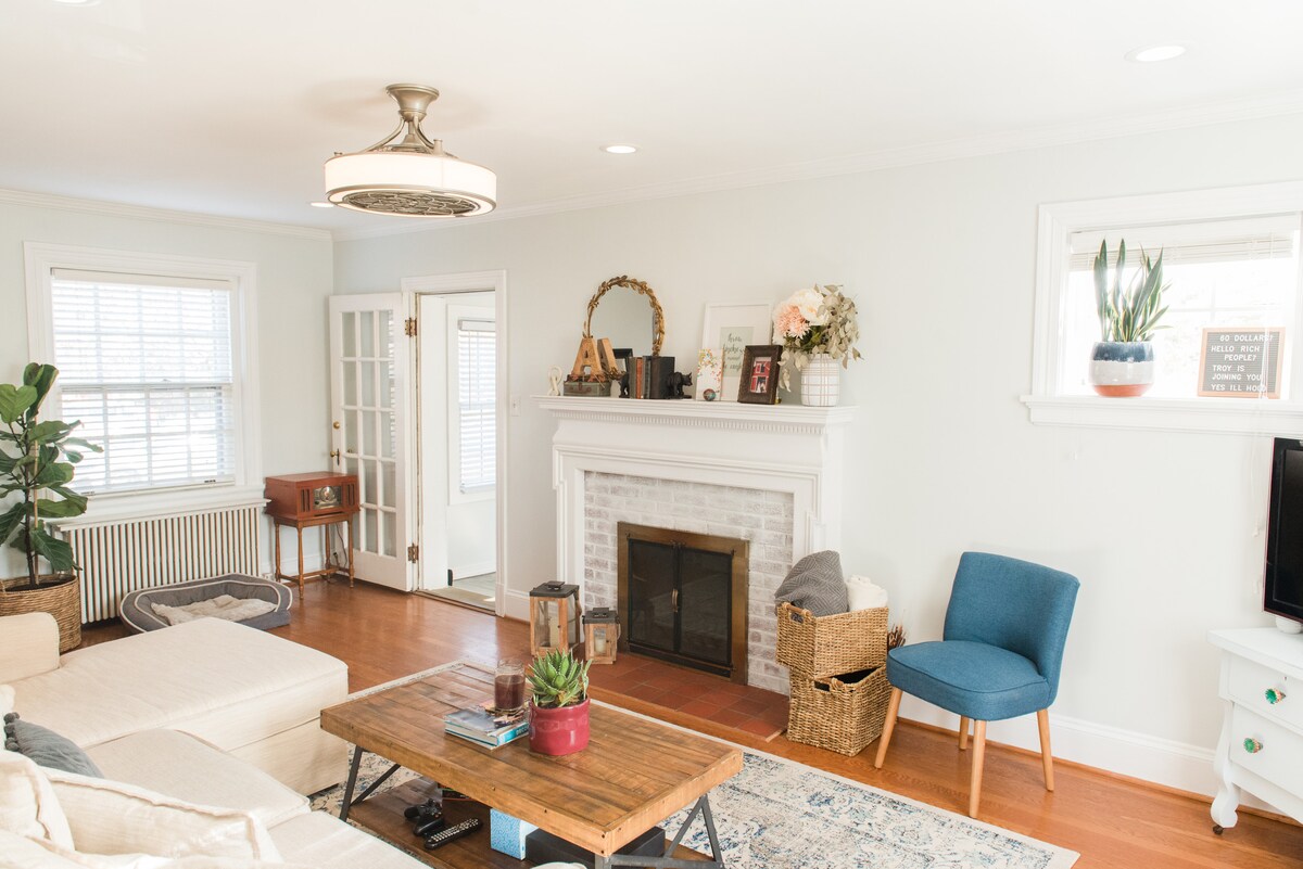 Розслабтеся в цьому унікальному і спокійному помешканні в межах 3 миль від центру Річмонда, VCU та вентилятора (також недалеко від виходів I 95/64). Розташоване в історичному районі Бельвю з ресторанами та магазинами в пішій доступності, це чарівне бунгало Arts and Crafts має відкриту атмосферу з великою сімейною кімнатою та їдальнею, кухнею з жерстяною стелею, м 'ясним островом та куточком для сніданку. Тут є 2 спальні, офіс і велика передня та задня веранда, які ідеально підходять для ранкової кави!
