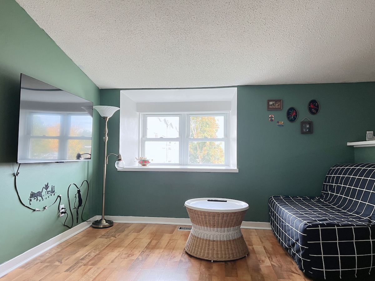 Ласкаво просимо до вашого ідеального відпочинку в нашому нещодавно побудованому підвальному номері-студії! Цей чарівний відпочинок спроектований як з розслабленням, так і з урахуванням функціональності. Наша студія може похвалитися повноцінною ванною кімнатою та добре обладнаною міні-кухнею для ваших кулінарних потреб. Крім того, ви знайдете розслаблюючий диван-ліжко, розташований біля красивого каміна, що створює затишну атмосферу для відпочинку. Залишайтеся активними, включивши бігову доріжку, яка зручно дозволяє підтримувати свою фізичну підготовку.