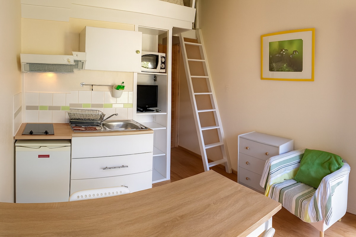 На першому поверсі в лісистому парку, це гарна та надзвичайно функціональна невелика студія, яку ми пропонуємо : 1 двоспальне ліжко на мезонініні, ванна кімната з ванною, обладнана міні-кухня, телевізор. Ми пропонуємо вітальні засоби ( мило, шампунь) Ви отримаєте перевагу від паркувального місця, паркування автоматично закривається вночі. У помешканні є автоматична пральня Наші стійки реєстрації готові надати вам усю необхідну допомогу та інформацію