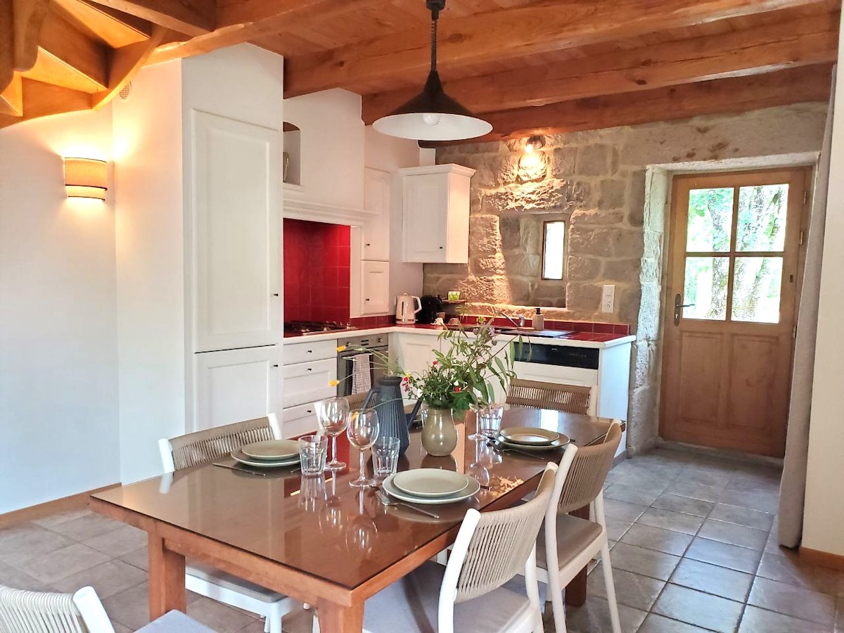 Чарівний кам 'яний фермерський будинок з кондиціонером і мережею Wi-Fi. Квітковий і лісовий сад. Басейн, сад з сезонними фруктами ( яблука, вишня, айва)... Затінена тераса, з місцем для багаття та суміжним басейном. Приватний доступ до сусіднього лісу для прогулянок відправлення. Зона відпочинку з іграми на свіжому повітрі...пінг-понг, гігант molkky mikado, петанк, ...Для спортсменів, вниз по Ардече, каньйонінгу та тенісу поблизу . Плата за прибирання включає постільну білизну та рушники на 6 осіб