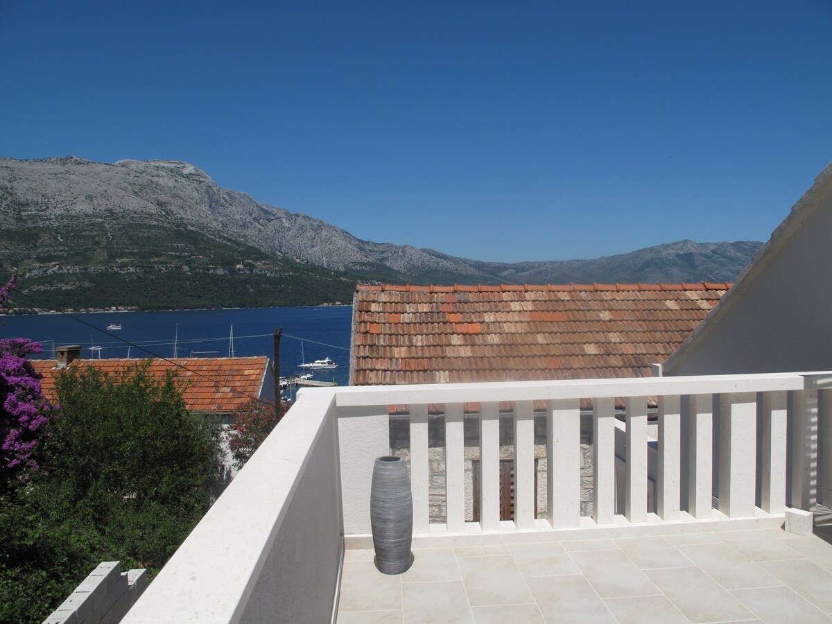 Розташований неподалік від пляжу, в 5 хвилинах ходьби від міста. Ця дворівнева квартира складається з дінігової кімнати/вітальні з терасою, кухні, ванної кімнати на головному поверсі та спальні з терасою з видом на старе місто Корчула на верхньому поверсі.