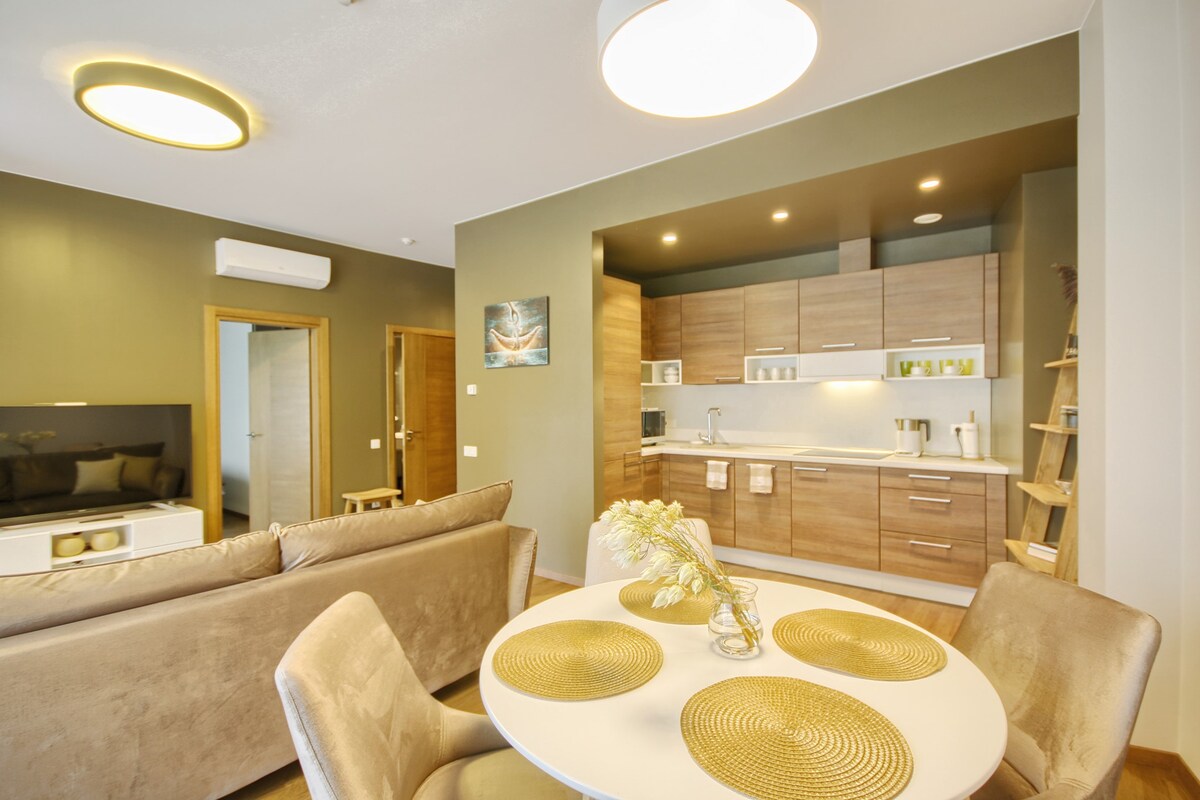 Нова квартира в самому серці Друскінінкай. Кілька кроків від "Аквапарку", канатної дороги до "Снігової арени" та всіх спа-центрів. Високоякісний інтер 'єр, високошвидкісний інтернет, IP-телевізор з великою кількістю каналів, Netflix, повністю обладнана кухня та ванна кімната. 2 спальні зі зручними робочими місцями. Не важливо, чи ви тут просто на вихідних, чи вирішили піти на роботу - все налаштовано на найкращі враження.