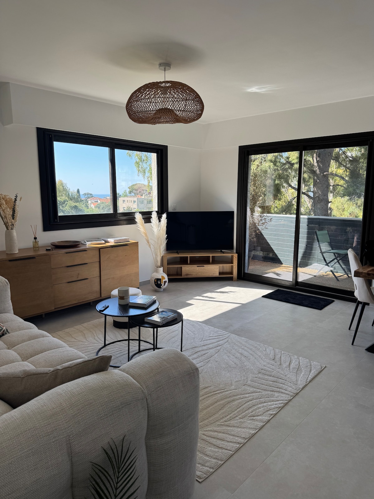 Повністю відремонтована квартира, 80 квадратних метрів, панорамний вид на море, красива тераса, в декількох хвилинах від моря та центру тростини в 15 хвилинах їзди на автомобілі/автобусі від фестивального палацу, недалеко від магазину канікул пішки (пішохідна зона), дуже затишний басейн, закритий гараж або безпечний відкритий парк (2-й додатковий паркінг за необхідності), обладнана кухня всією побутовою технікою, ванна кімната плюс душова кімната, 2 окремі туалети, ідеально підходить для сім 'ї з дітьми або парами, волоконний Wi-Fi, міжнародне телебачення