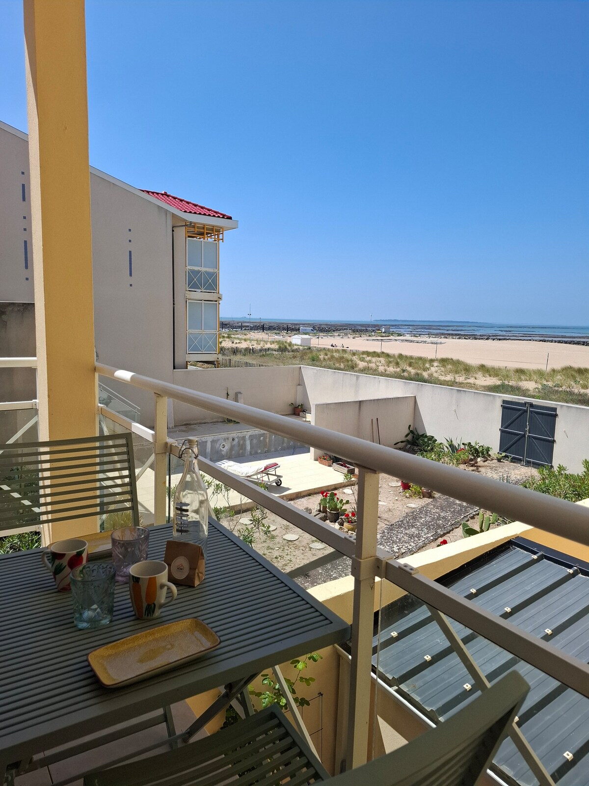 Квартира на терасі з видом на море на 1-му поверсі УНІКАЛЬНА! - усі зручності. Ліжка, зроблені після прибуття, надається постільна білизна. Чарівність цього будинку відповідає унікальному розташуванню такого роду. Ви зможете скористатися двома окремими спальнями, кожна з яких має власну ванну кімнату. Поруч магазини, ресторани. Безпечне зберігання велосипедів. 1 зарезервоване паркувальне місце. Вид на пляж захоплює дух, постійне шоу моря, що піднімається і опускається. Унікальний схід сонця.