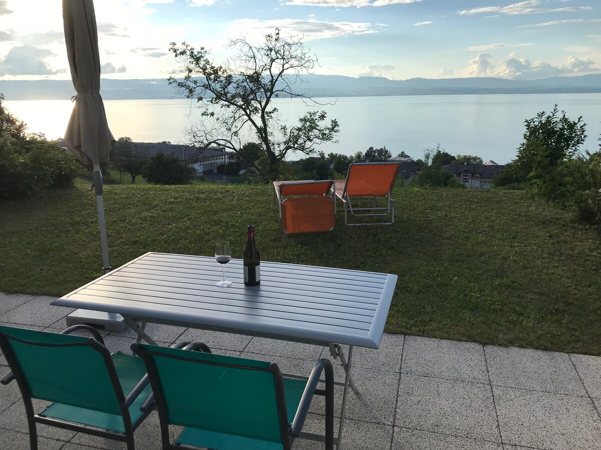 Гарна квартира, 50 м2 + сад 30 м2. Вид на озеро та гори. Спільний прогрітий басейн з 1 травня до середини вересня. Двуспальне ліжко, додаткове ліжко (матрас на підлозі). Квартира розташована поруч зі спортивним полем та дитячим майданчиком. 14 км від Лозанни (15-30 хвилин на поїзді) та 10 км від Монтре. Пляжі на відстані 10 і 20 хвилин ходьби. 2 хвилини від крихітного залізничного вокзалу та об 'єктів (супермаркет тощо) Жодної автостоянки в резиденції, але легко (платно)