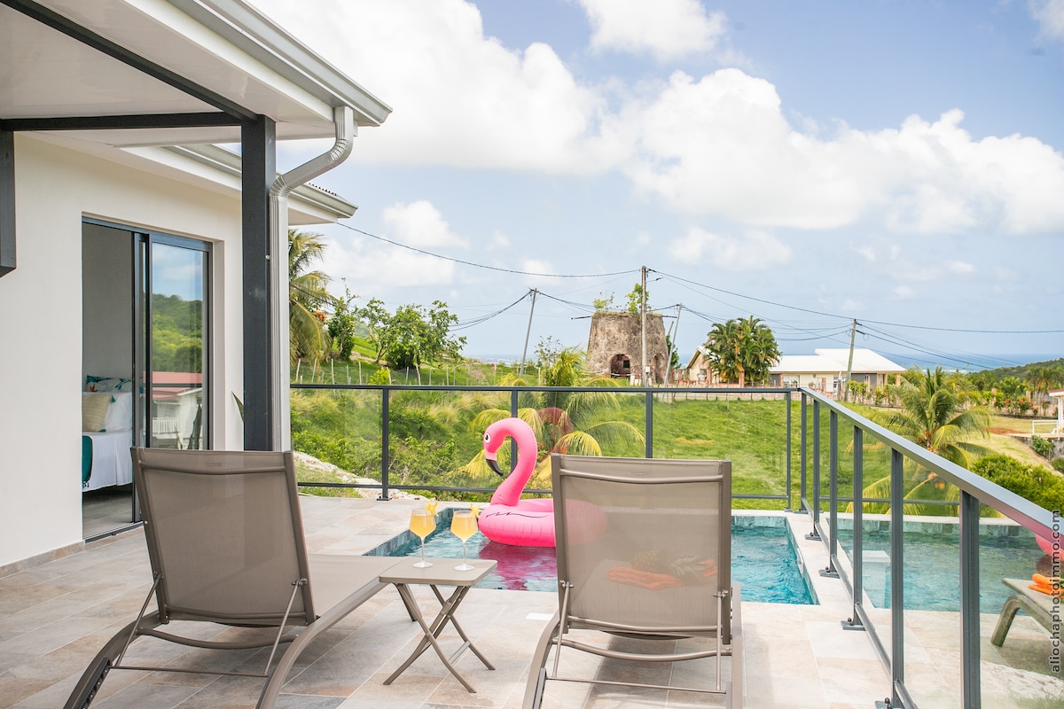 Magnifique Villa individuelle de standing. 100% bioclimatique, sur Sainte Luce, avec petite piscine privée, vue mer, et à 2 minutes de la plage. Vue panoramique incroyable à 180 degrés sur la Mer des Caraïbes, et vue sur Sainte Lucie (île voisine). Nichée en pleine nature, vous profiterez du chant des oiseaux, et du jardin tropical. Aucun vis à vis. Pas de fêtes, ni de réceptions autorisées. L’endroit est très calme : un vrai havre de paix !