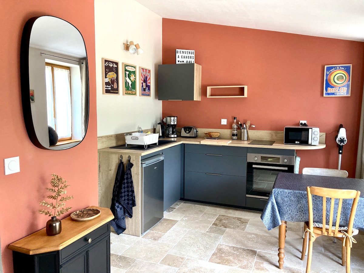 Розташований за 2 км від села Лалбенке (столиця чорних трюфелів), за 15 км від Каора та за 20 км від Сен-Сірк-Лапопі . Наша гастрономічна будівля площею 35 м2 запропонує вам затишну та спокійну обстановку. Починаючи з позначених стежок для піших прогулянок/катання на гірських велосипедах і за 1,5 км від стежки Сантьяго-де-Компостела (GR65). Розташований у парку Регіональний парк Causses du Quercy (за класифікованим ЮНЕСКО), є багато унікальних візитів, таких як Phosphatières du Cloup d 'Oural, igues, dolmens, gariottes...