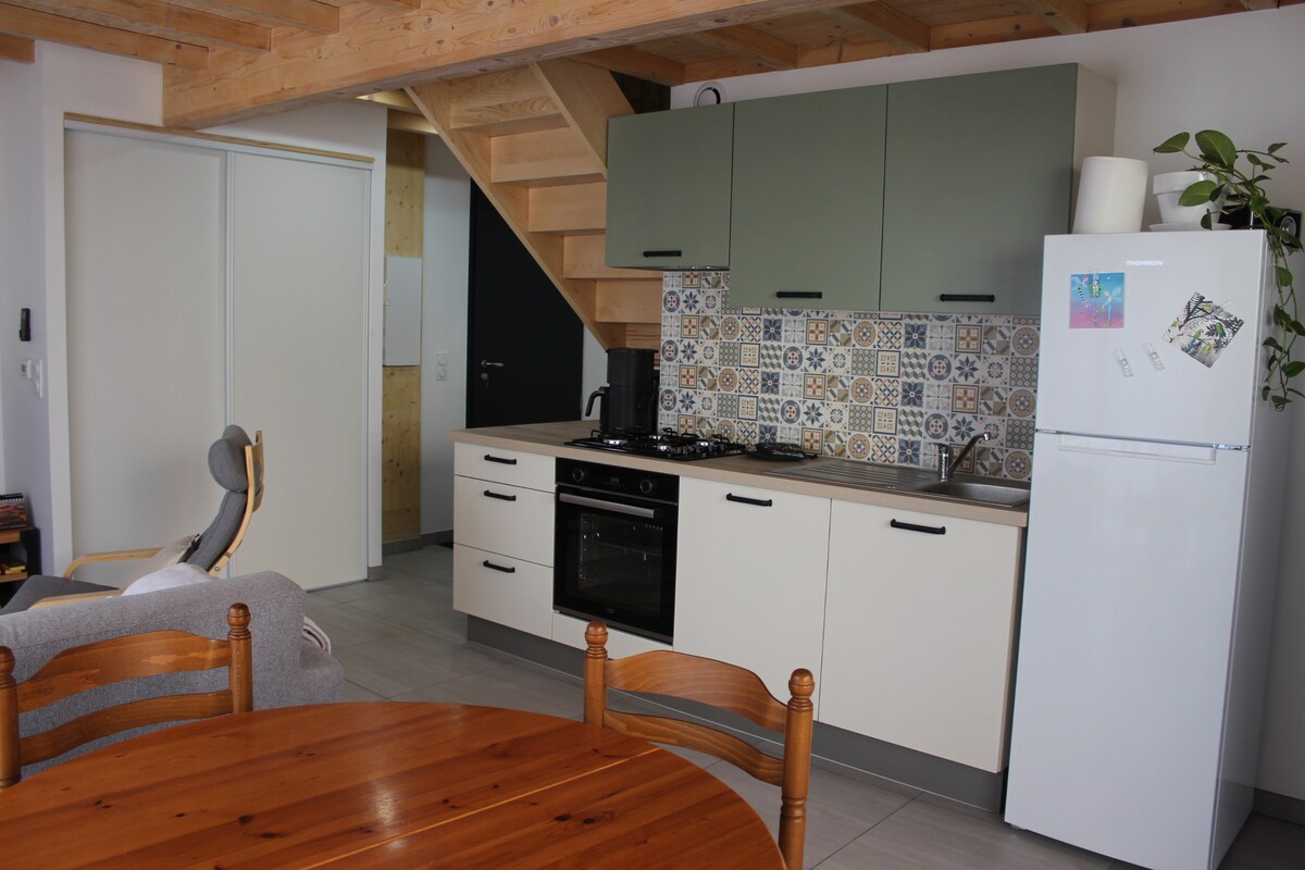 Чудова тиха квартира, абсолютно нова, затишна, з паркувальним місцем перед помешканням. Виходячи на південь, ви матимете гарну терасу та приватний сад (з видом на гори), ви зможете насолодитися комфортним номером з великим двоспальним ліжком, вітальнею з повністю обладнаною міні-кухнею та ванною кімнатою з окремим туалетом. Ви будете в 45 хвилинах від перших гірськолижних курортів або Гренобля і всього в 25 хвилинах від Шамбері та Альбертвіля. Шосе в 5 хвилинах їзди.