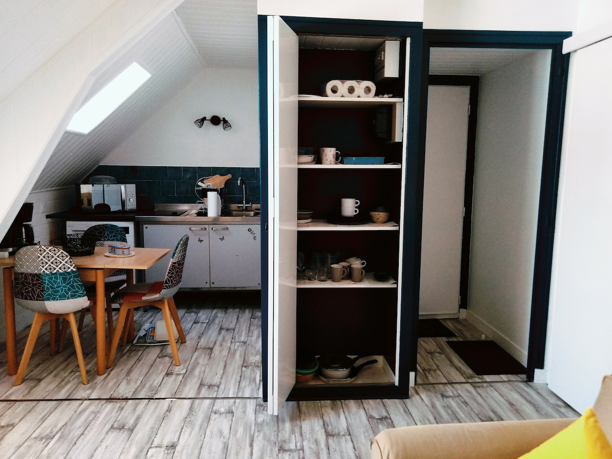 Студія-мезонін площею 25 м2 з балконом з видом на море. Навпроти цитаделі Вобан можна побачити острів Уат на відстані. Квартира класифікується на 2 зірки Франції. у вас є два ліжка 140 і 90, повністю обладнана кухня з посудомийною машиною, ванна кімната з великою душовою кабіною, телевізором з плоским екраном і Wi-Fi. Для вашого перебування надаються простирадла. Розташований за 50 м від посадкового етапу Le Palais, помешкання порту є ідеальною відправною точкою для вашого відпочинку.