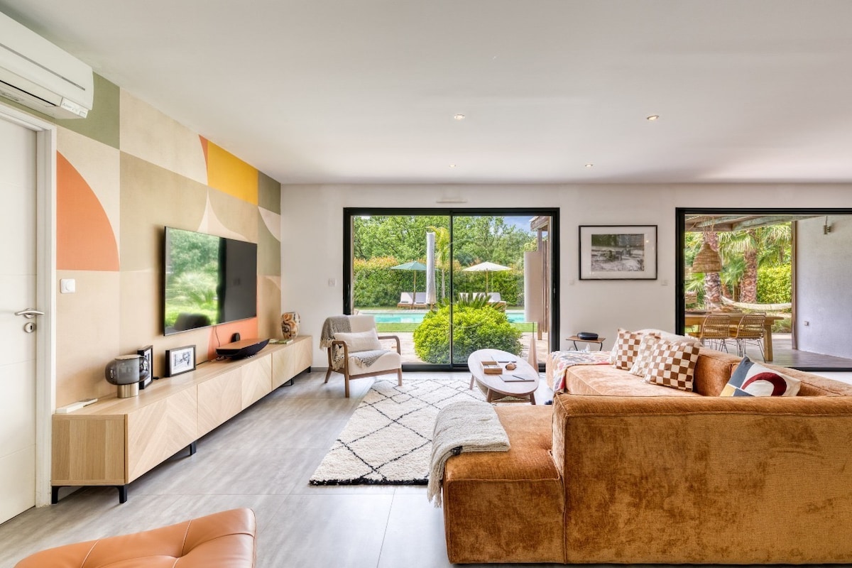 Красивий провансальський фермерський будинок абсолютно новий, на виході з чарівного селища План-де-ла-Тур. 4 спальні, 3 ванні кімнати, 1 велика вітальня з вітальнею, їдальня, відкрита кухня з видом на патіо на відкритому повітрі з величним видом на пагорби Плен-де-Мурс. Приватний басейн, петанк, у невеликому тихому районі, в 15 хвилинах від пляжів і в 10 хвилинах від Сент-Максіма або Грімо. Сімейний відпочинок, гарні походи, насолоджуйтеся!