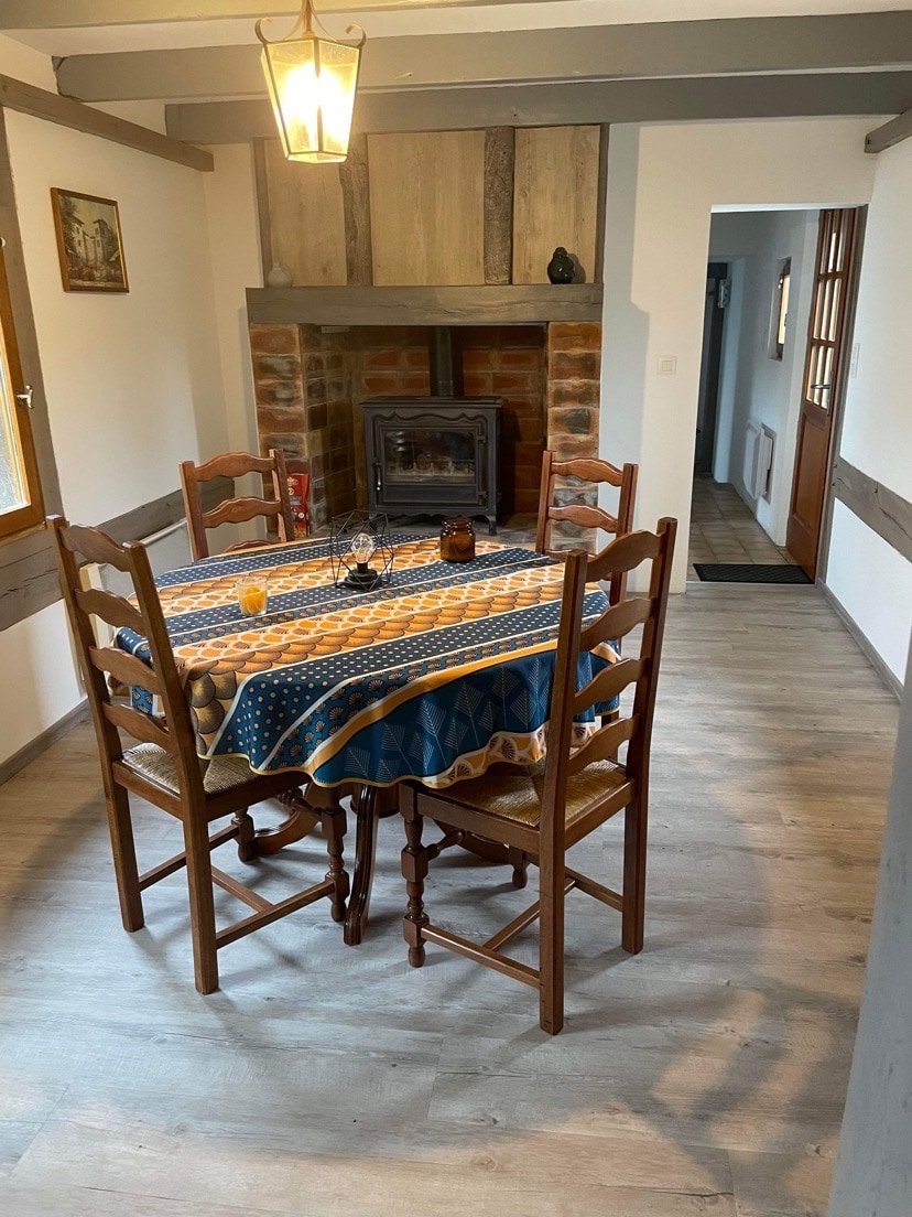 Bienvenue dans notre campagne normande Vous profiterez d’une charmante chaumière rénovée en 2022. La propriété se situe au milieu d’une pommeraie de 3ha. Vous êtes entre Pont-L’Évêque, Cormeilles et Pont Audemer. A 1h40 de Paris et 30 min des plages de la côte normande. Vous pourrez vous balader dans la campagne environnante et Honfleur se situe à 20 min et Deauville/Trouville à 25/30 min Maison de 120m2 pouvant accueillir 8 personnes ; idéale pour 6 adultes et 2 enfants ou 2 famil