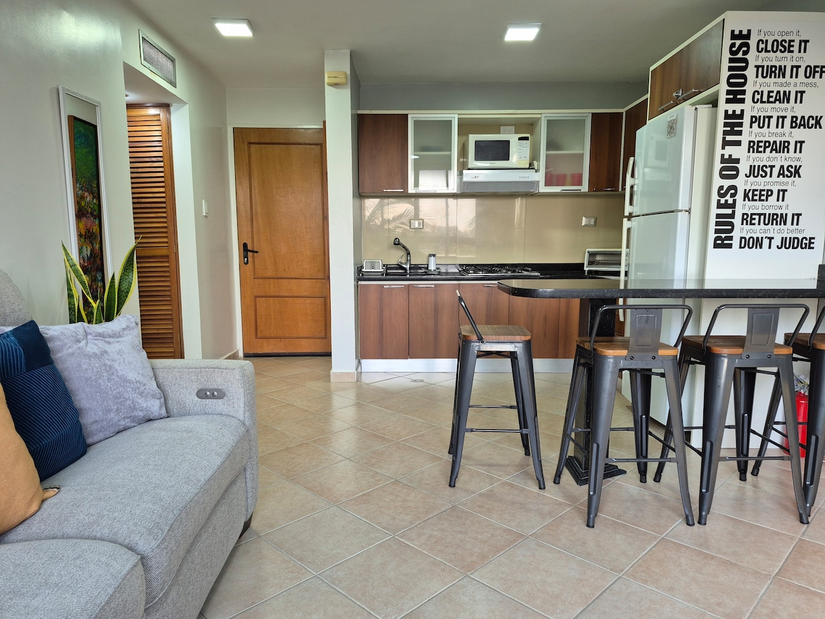 Розважайтеся всією сім 'єю в цьому карибському стилі для відпочинку або ділових поїздок, де можна насолодитися басейном і доступом до бульвару Плайя-Лос-Каналес на молочних фермах. Поруч ресторани, пекарня та аптеки. У цьому помешканні є кімната з двоспальним ліжком, а у вітальні - двоспальний диван-ліжко, де комфортно розміщувати до 4 осіб. Приходьте, ми очікуємо