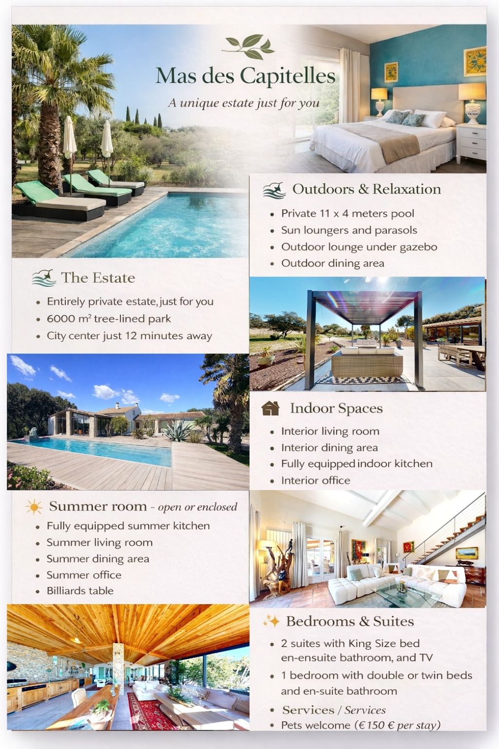 Відкрийте для себе цей прекрасний просторий будинок, який може вмістити до 12 осіб, розташований всього в декількох хвилинах від знаменитого мосту Пон-дю-Гар. Насолоджуйтеся ідилічною обстановкою з великим приватним басейном, який ідеально підходить для відпочинку сімей або груп друзів. Ідеально обладнаний і сучасний будинок пропонує всі зручності, необхідні для незабутнього перебування. Незалежно від того, чи ви захоплюєтеся історією, природою, чи шукаєте відпочинок, ця оселя відповідатиме всім вашим очікуванням