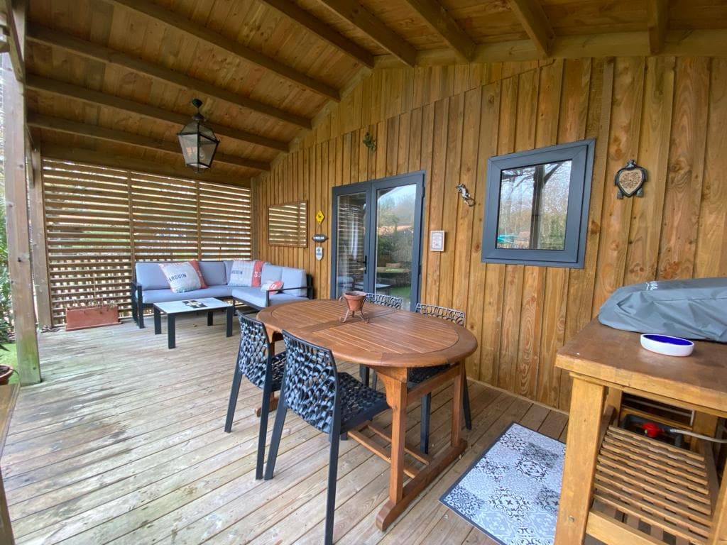 Шале площею 40 м2, яскраве, повністю обладнане та обладнане кондиціонером, з Wi-Fi. - Дві спальні - кухня відкрита до вітальні (посудомийна машина, мікрохвильова піч, кавоварка Senseo,чайник, духовка, морозильна камера, тостер, індукційна тарілка). - Ванна кімната з розслабляючою ванною та туалетом. Зовні ви зможете насолодитися приватним садом площею 250 м2, СПА-САЛОНОМ, терасою площею 50 м2 з видом на зону барбекю. Парковка для автомобіля. Постільна білизна та рушники надаються.