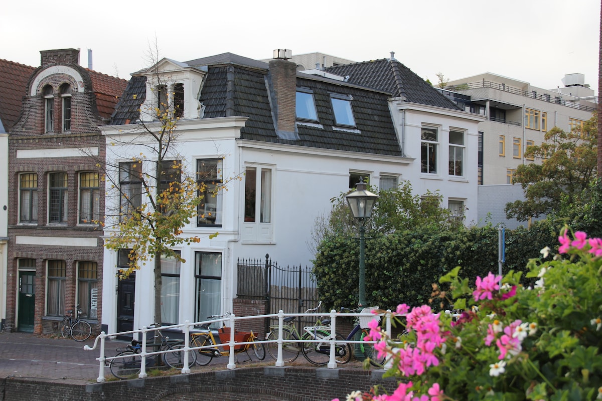 Ця красива світла кімната з оригінальними елементами розташована в центрі Лейдена, всього в декількох метрах від мерії. Спальна зона та вітальня відокремлені один від одного розсувними дверима з вітражем. З затишної вітальні відкривається вид на затишний Ботермаркт, розташований на території найкрасивіших каналів Лейдена. Красива світла кімната має багато оригінальних деталей. Це особливе місце розташоване неподалік від усього, що полегшує планування візиту.