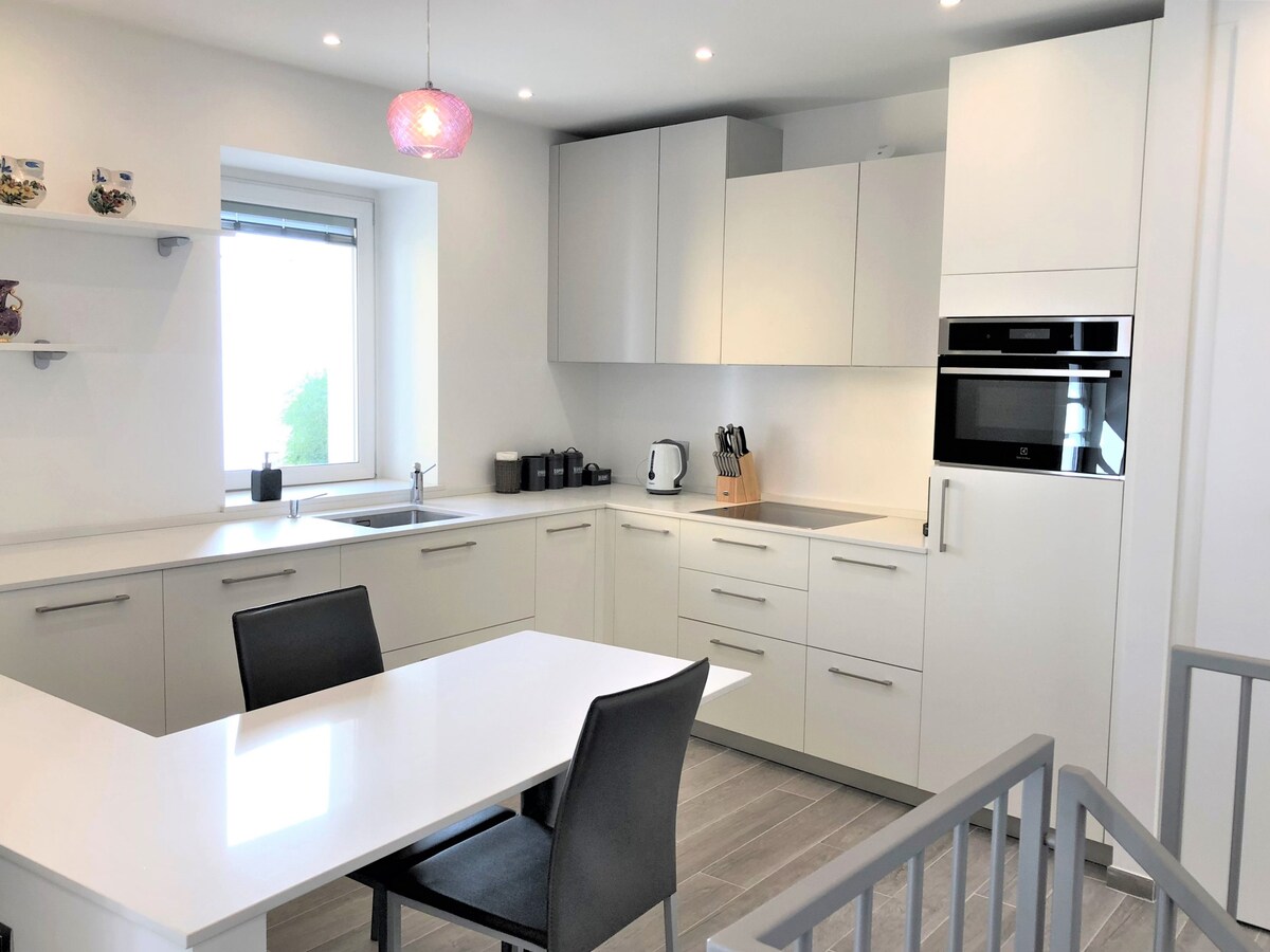 Сучасна квартира на першому поверсі нової резиденції зі спа-центром і панорамним видом. Ця квартира має красиву терасу. Вітальня – це великий відкритий простір із повністю обладнаною кухнею, зоною для розмов та обіднім столом. ГАРАЖ: підходить для середніх/малих автомобілів. Додаткова безкоштовна парковка поруч (вказана в інструкціях, які будуть надіслані)