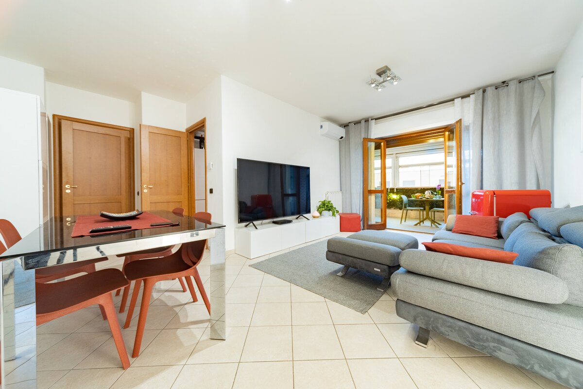 Світлий пентхаус на 7 поверсі з критою відкритою верандою. Розташоване в районі парку Леонардо, всього в одній зупинці поїзда від аеропорту, в пішохідній зоні торгового центру Wow Mall. Нещодавно відремонтована квартира з прекрасним краєвидом на аеропорт Ф'юмічіно. Залізнична станція Parco Leonardo знаходиться всього за 450 метрів, звідки можна дістатися до центру Риму всього за 20 хвилин, а до виставкового центру Fiera di Roma — за 5 хвилин. Простора парковка без нагляду. Туристичний податок на проживання не входить у вартість.
