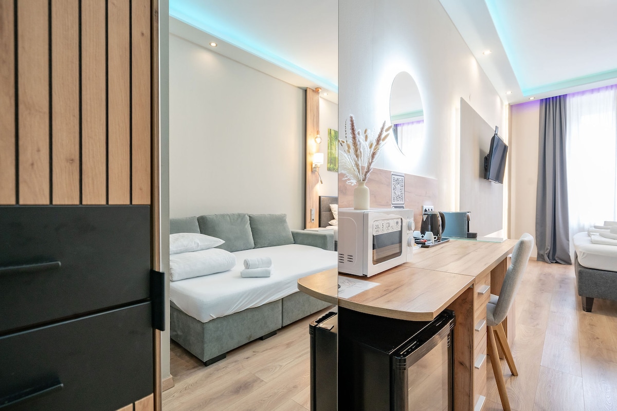З цього помешкання можна легко добиратися до багатьох місцевих прихованих перлин. У цій студії є звукоізольовані стіни, міні-бар і суміжна ванна кімната з душем і феном. До послуг гостей кухня. Студія також обладнана кондиціонером і має власний вхід, а також телевізор із плоским екраном і супутниковими каналами. Вино/шампанське також готові для вас. Житловий блок обладнаний двоспальним ліжком. Також є робочий стіл.